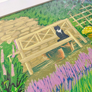 So, with that excuse nicely lined up, I can confidently say that throughout June, I have been going with the creative flow! This has led to a series of mini watercolour illustrations inspired by some random frames I found, a watercolour landscape of a shady spot at Attingham Park, a watercolour portrait of my 2yo daughter, the completion of my reduction lino print of a cat on a bench, a lino print of some lolloping hounds, and a challenging, but ultimately enjoyable, commission of a classic car.